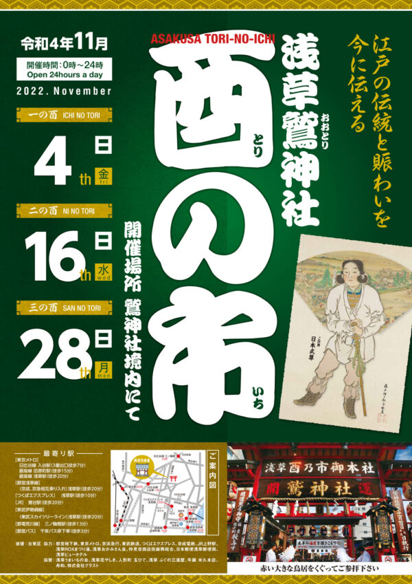 令和元年の酉の市は11月8日(金)・20日(水)に行われます。 今年の酉の市は二の酉までですので、お間違えのない様にお越しください。